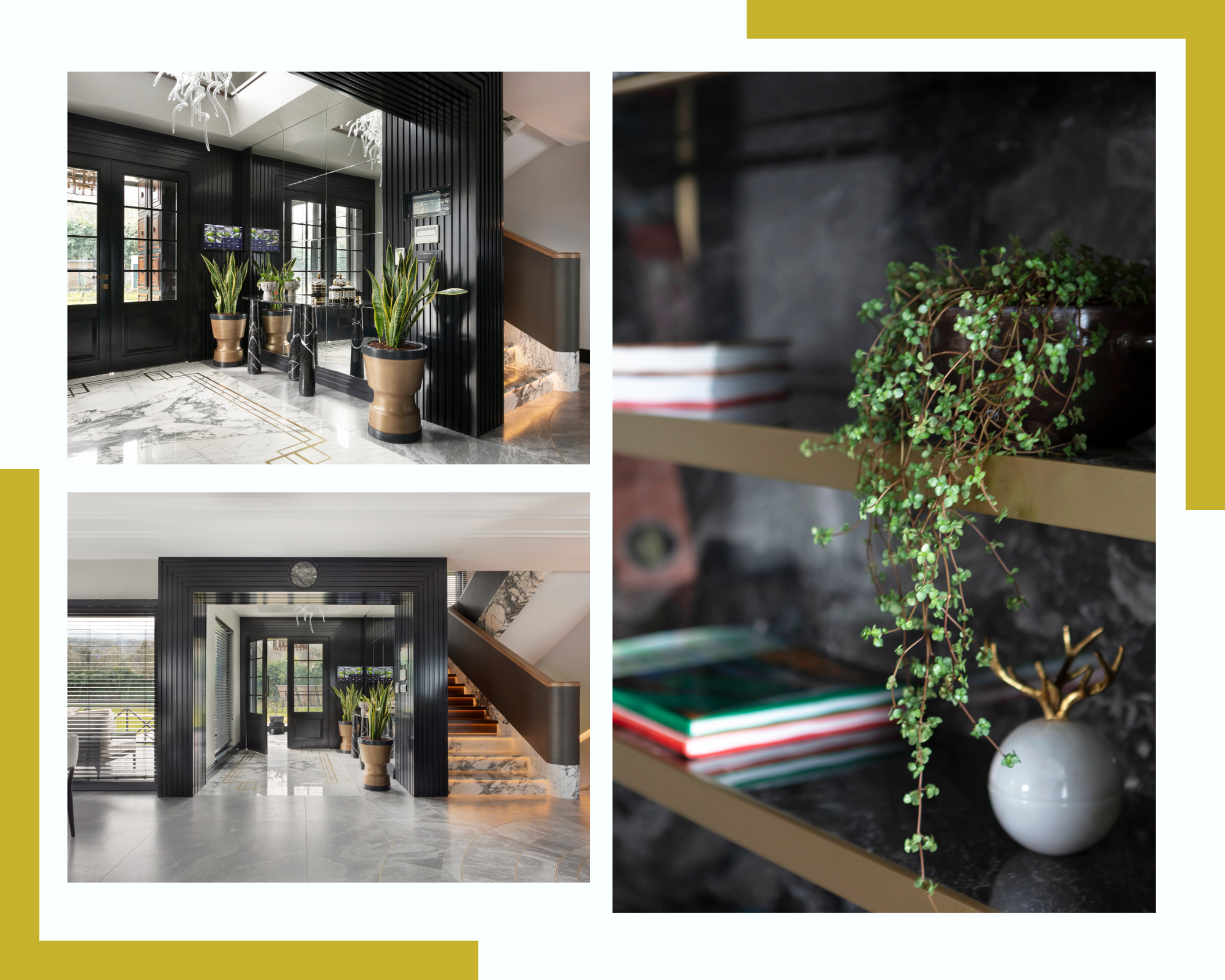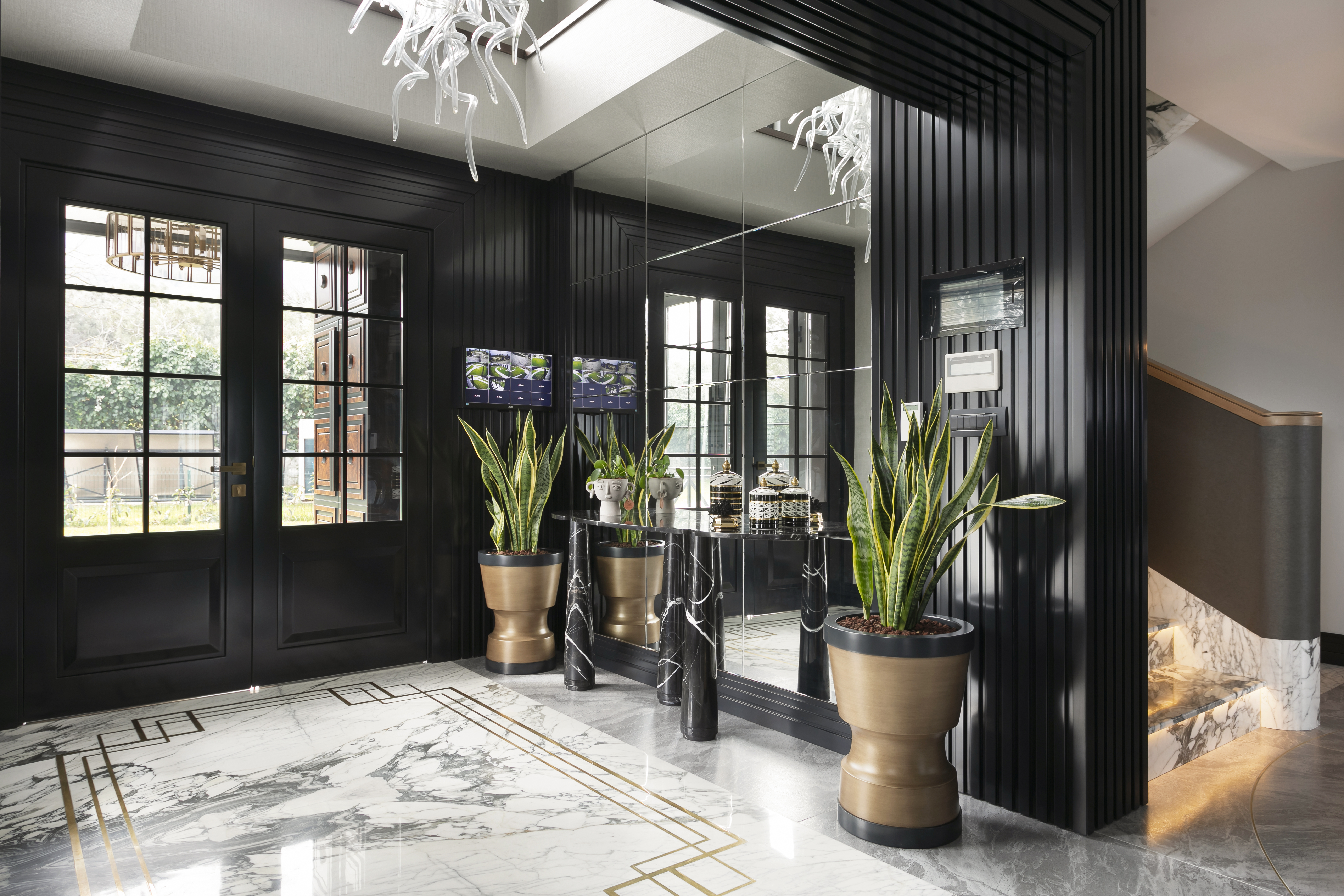 At the entrance of the basement floor, a stylish look was achieved with the flooring made of Alexandrette Black and Calacatta Premium marbles. Steps and piers at the ground floor main entrance extended into the main entrance in a way to reflect the natural depth of Italian Arabescato marble with 6-pack bookmatch application. The Arabescato marble was used in the form of 2-way bookmatch on the floor covering that creates a sense of integrity as you enter inside. The inner brass laths were applied via the milling application. An elegant look was obtained by placing brass on the details created by this process. The final touch to the main entrance was made with led lighting.