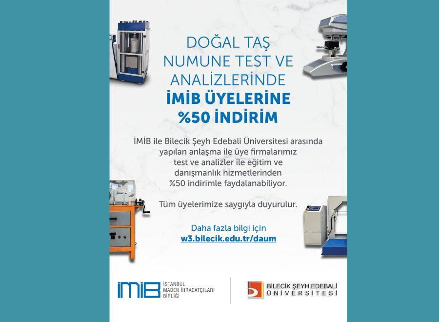 Bilecik Şeyh Edebali Üniversitesi (BŞEÜ) bünyesinde yer alan Doğal Taş Teknolojileri Uygulama ve Araştırma Merkezi (DAUM) ile İstanbul Maden İhracatçıları Birliği (İMİB) arasında imzalanan iş birliği protokolü çerçevesinde DAUM bünyesinde yapılan test ve analiz işlemlerinde İMİB üyelerine yüzde 50 indirim sağlanacak.
